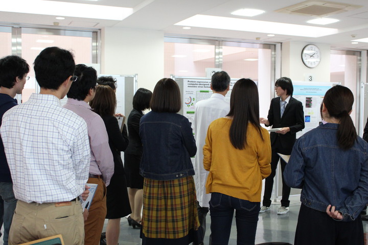 10月19日(金)、コラボステーションⅡコミュニティラウンジにて、生命科学科3年生の英語によるポスター発表会が開催されました。この発表会は、学生が「前期研究室配属」、それに続く「フリークォーター」の期間に配属された研究室での研究成果から英文論文を作成したものをポスターにまとめ発表するもので、進行、プレゼンテーション、質問応答などすべてが英語で行われます。