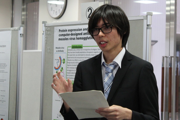 発表は、プレゼンテーション10分、質疑応答5分のひとり15分で行われました。事前に繰り返し練習した成果もあり、ほとんどの学生が制限時間内に明快に発表が出来ていました。配属研究室の指導教官の先生も参加し、学生、教員から活発な質疑がなされました。英語での返答に苦慮する部分もありましたが、学生は賢明な説明をしようと努力していました。