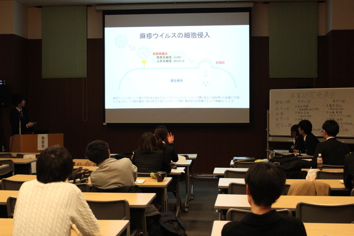 2月8日(金)13:30~16:40に総合研究棟1階の105号室で、医学部生命科学科4年生の卒業研究発表会が開催されました。伊藤生命科学科長をはじめとして、卒業研究の指導教員、同じ研究室の仲間、生命科学科3年生等多数の参加があり、学生達の引き締まった発表並びに質疑応答が展開されました。