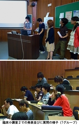 「コアセミナー」とは、学生が5名程度の少人数グループに分かれ、学習テーマから自分たちで学ぶべきことを導き出し、調べ、話し合い、理解を深めながら問題を解決していく学習スタイルです。グループにはチューターとして指導教員(原則として担任教授、あるいはその分野の教員)が1名ずつ配置されています。チューターはグループ学習の進め方、調査や発表の仕方などについてアドバイスはしますが、あくまで学生が主体であり、学習のプロセスを計画し、実行するのは学生です。つまり、「学び方を学ぶ」ことが目的であり、どのようなプロセスを経て学ぶのかが重要視された授業です。学習した成果は、最終的に1つのプロダクトとしてまとめ上げ、プレゼンテーション・ソフトウェアを使い、最終日の7月15日に臨床小講堂2で行われた学習成果発表会でグループ全員が発表しました(各グループの持ち時間は25分間)。したがって、当日を迎えるまでに、他の人にわかりやすく説明できるまで深く調べ、考え、理解しておくと同時に、発表のスキルも研鑽します。成果発表会では、自分たちが発表するだけではなく、他のグループの発表に対して質問をすることも経験します。 「コアセミナー」の評価は、知識、技能、態度の側面から行われ、さらにチューターによる個人内評価が加わります。また、学生も自分自身の学習過程を「自己評価」します。学生自身が自分の学習状況を評価し、将来の方向を自分で計画できるようになること(自立)はこのコースの大きな目標です。 平成22年度の生命科学科1年生は、3つのグループに分かれて、Tグループは「移植医療について考える」、Uグループは「培養細胞の電子顕微鏡観察(できたかな?)」、Vグループは「タマネギからDNAをとってみよう!」のテーマで「コアセミナー」学習に取り組みました。