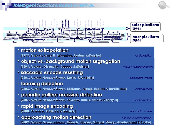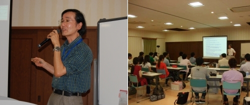 3回目を迎えたキャリア・アップ夏合宿は、「脳科学」関連をテーマとし、宗像市にある保養・研修施設「グローバルアリーナ」で9月25、26日に開催されました。世話役の飛松教授により、ロール・モデルとして3名の研究者のお話を伺う場として企画されました。 最初の講演者として、熊本大学大学院自然科学研究科の准教授として活躍されている林田祐樹先生に「網膜と脳と私」の題目で講演していただきました。初めに、国立佐世保工業専門学校電気工学科の高学年時に観た映画「StarWars:エピソード5」にでてくるロボットの義手に興味を持ち、「生体神経とロボットのインターファイス」を夢見て九州工業大学に進学され、その後、生体神経の仕組みにのめり込まれたという経験をお話しされました。その後、州立カリフォルニア大学Davis校への留学時代から始まった「網膜の細胞で何が行なわれているのか?」という視覚情報の網膜での前処理の役目に関する研究内容を過去10年くらいの間で急速に展開したトピックス(資料1)と、当時の研究の話をされ、また熊本大学でのヒト脳への磁気刺激と脳-筋肉間の活動相関性、さらにはカーボン・ナノチューブを利用した神経電極の開発に関する最近の研究を紹介していただきました。