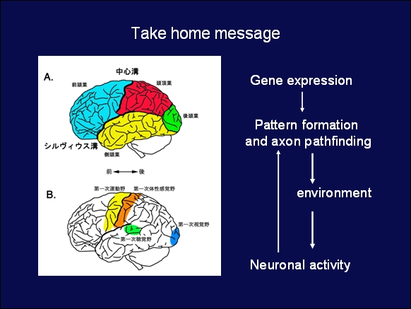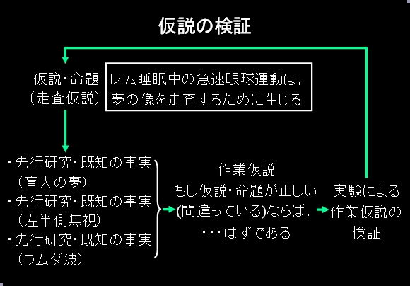 2番目の講演者として、千葉大学薬学部の大学院博士課程修了後にシカゴ大学薬学部でのポスドクを6年経験された後、2004年から(独)理化学研究所脳科学総合研究センターのチームリーダーを担当されている下郡智美先生により「Forebrain development(視床の発生と進化)」と題した英語による講演をしていただきました。導入部分では発生学上、非常に有名なシュペーマンによるオーガナイザーの研究を紹介され、神経管からのForebrain(終脳)、Midbrain(中脳)、Hindbrain(後脳)へのパターン等につき、ニワトリとウズラのキメラの解析やmorphogenとしてのFgF8を自在に操作することでマウスの初期発生の段階での形成過程の変化について、極めてユニークな子宮内遺伝子導入法(FgF8を発現するように構築したプラスミドDNAを胚の目的の部位に注入し、電気刺激し、時間、場所特異的な過剰発現を行う)を用いた研究成果をお話されました。幼少期(2歳半から)の在米経験の上に、長期の米国での留学経験によりネイティブスピーカー並みに流暢な英語を話されましたが、日頃あまり英語での講義に慣れていなかった学生諸君には、話の内容を理解するのが精一杯だったのかもしれません。それでも「あまり上司(指導者)に言われた通りのことをする必要は無い」という、自分の頭で考え研究の突破口を開かれた先生からのメッセージはインパクトがあったろうと思われます。この他、理化学研究所でのサマープログラム(2週間の講義主体のコースや2ヶ月のインターンシップ)も紹介され、意欲がある学生への積極的な参加を呼びかけられました。(資料2) 2日目の午前中の講演者として、心理学から睡眠研究に入り、現在(独)情報通信研究機構未来ICT研究センターの研究マネージャーとしてご活躍中の宮内哲先生から「夢を見ている脳を見るー脳波、神経心理学からfMRI研究の最前線までー」と題するお話がありました。レム睡眠(Rapid Eye Movement Sleep)中の急速眼球運動に関する“夢の中の像を走査するために生じる”という「走査仮説(Scanning hypothesis)」の真偽について、仮説の検証過程(先行研究を踏まえた仮説・命題の提示→作業仮説→実験による作業仮説の検証)(資料3)に即した実例を示されました。今年発表されたREM sleep behavior disorder(RBD)患者において、goal directedな行動としてレム睡眠時の急速眼球運動の方向が一致しているという報告や、左半側無視(left hemineglect)等のご自身の研究成果を含めて紹介されました。最後に、2002年の研究構想から始まり、色々な試行錯誤を経て論文作成・受理に至る長年の取組みを含めた「脳波とfMRIの同時計測による走査仮説の検証」の研究成果で締めくくりをされました。