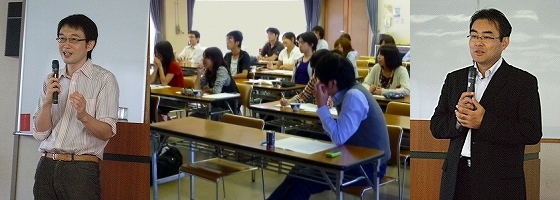 2番目の講演者として、歯科医師として口腔外科領域で臨床を進めながら、日本で最初の再生医療に特化したベンチャー企業J-TEC(1999年起業)の常務取締役研究開発部長としてご活躍の畠先生に「再生医療を斬る 生命科学と新しい医療の普及と産業化のはざまにあるもの」と題するお話をしていただきました。最初に、1975年に実施された自家増殖の表皮の細胞培養を使った移植の例や1981年の例等を示され、再生医療の先駆けの研究、日本における再生医療の産業化の現状(2009年現在、臨床試験の前段階である確認申請に適合したものが9品目のみである等)を詳しくご説明いただきました。一方で、「Vacanti 兄弟らのヌードマウスの背中に軟骨細胞によって耳を形成させた例」を糸口とした再生医療に対する世間のやみくもなヒートアップ状態に関して、そろそろ考え直す時期に来ていること、そしてその際のポイントとして、「① 今までに治らなかったものが治る」という観点のみでなく「② より患者の負担の少ない方法で治る」、「③ 高度・複雑な治療手技を要することなく治る」、という観点も重要であり、今後の取組むべき課題を示されました。その中には、「安全性・有効性の客観的評価基準」をどう取扱うべきか、通常の医療における医師と患者との間の信頼関係をベースにさらに産業化への信頼関係の構築が必要であること、生命医科学研究者による医師の立場を超えたイマジネーションによりパラダイムシフト[in vivo Medicine → ex vivo Medicine]が達成されることへの期待等を話されました。数々の実例や分かりやすい例えのスライドを準備され、最後に生命科学科の学生へ「医療におけるプロの科学者として若い柔軟な発想を展開して欲しい」とのメッセージをいただきました。多くの学生にとって啓発的で刺激が多いお話であったと思います。