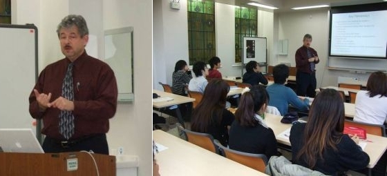 九州大学医学部との部局間交流協定を締結しているカナダのカルガリー大学医学部教授のRancourt博士による「The Importance of Practicing Leadership in Graduate School」という題でセミナーが開催されました(於:基礎研究A棟2階セミナー室)。英語だということで尻込みすることが無いようにと、生命科学科の2~4年生向けにML配信を行なった結果、15名の学生さんが参加してくれました。学部学生対象ということで、少しゆっくりとした話し方で、研究者になるのに必要なことについて、特にリーダーシップ能力を如何に身に付けるかの話がありました。その後、勇気を出して質問した数人の学生との間で質疑応答が行なわれました。学生さん達には、今後も様々な機会を捉えて、積極的に英語によるコミュニケーション能力を高めてもらいたいと希望します。なお、Rancourt博士は日本学術振興会の外国人研究者招へい(短期)事業で、九州大学医学部訪問教授として10月10日~11月1日の期間来日され、期間中には、九州大学の医系キャンパスのみならず、東京大学医科学研究所、熊本大学生命資源研究・支援センター、京都大学iPS細胞研究センター等でも講演をされています。