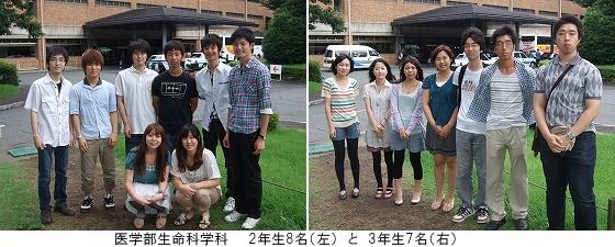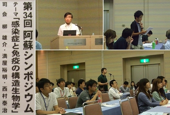 梅雨明け以降の連日の猛暑から抜け出したい気分の中、九州の真ん中の涼しい高原に在る阿蘇リゾートグランヴィリオホテルを会場に開催された第34回阿蘇シンポジウムに、医学部生命科学科2年生8名と3年生7名の合計15名が参加しました。 昭和52年から(財)化学及び血清治療法研究所が阿蘇で毎年夏に開催するほぼクローズドのシンポジウムは、微生物学、免疫学を中心とした基礎および臨床研究に関する専門の研究者が研究発表や討論を行うもので、その質の高さは国内外の注目を集めてきています。今年は、平成22年7月30日から31日にかけての一泊二日の日程で、九州大学の医学研究教授の柳雄介先生、並びに熊本大学の満屋裕明教授と西村泰治教授の3名の先生のお世話で、“感染症と免疫の構造生物学”をテーマに開催されました。