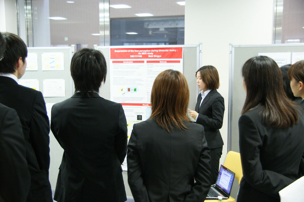 繰り返し練習をした成果が出ており、ほとんどの学生が時間通りに明快に発表ができていました。発表当日は直接研究をご指導いただいた教室の先生にも参加していただき、会場では英語による活発な質疑が行われ、学生は英語での返答に苦労しながらも勉強した成果を賢明に説明しようと努力していました。