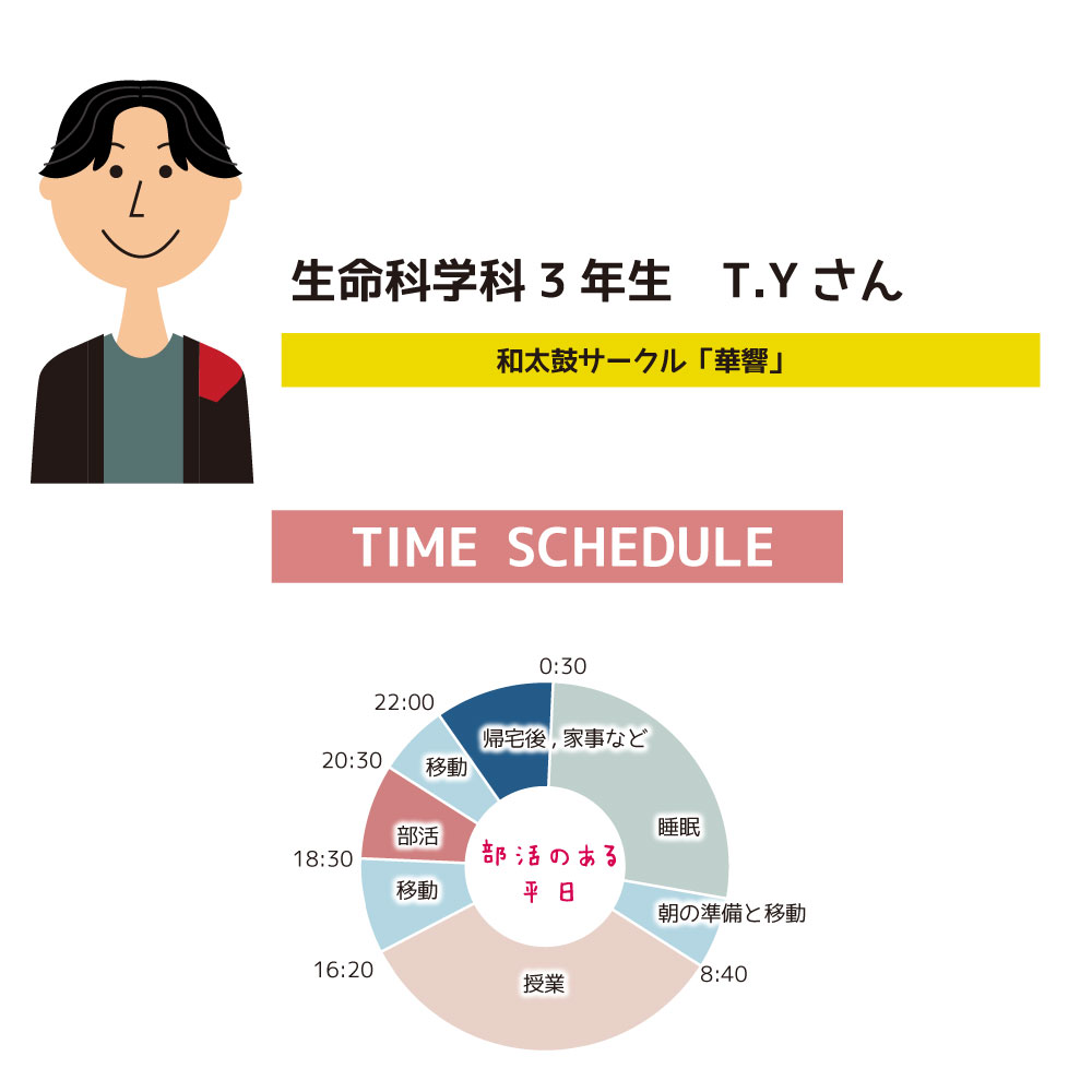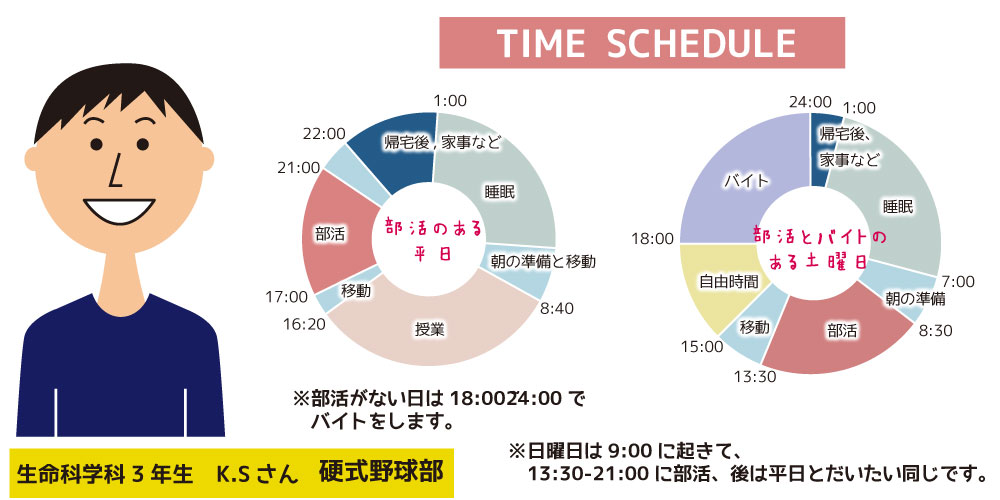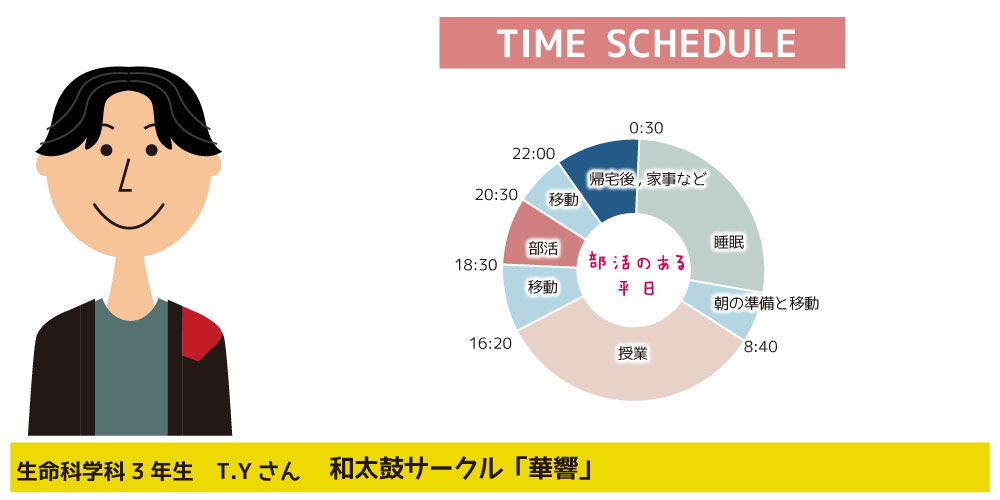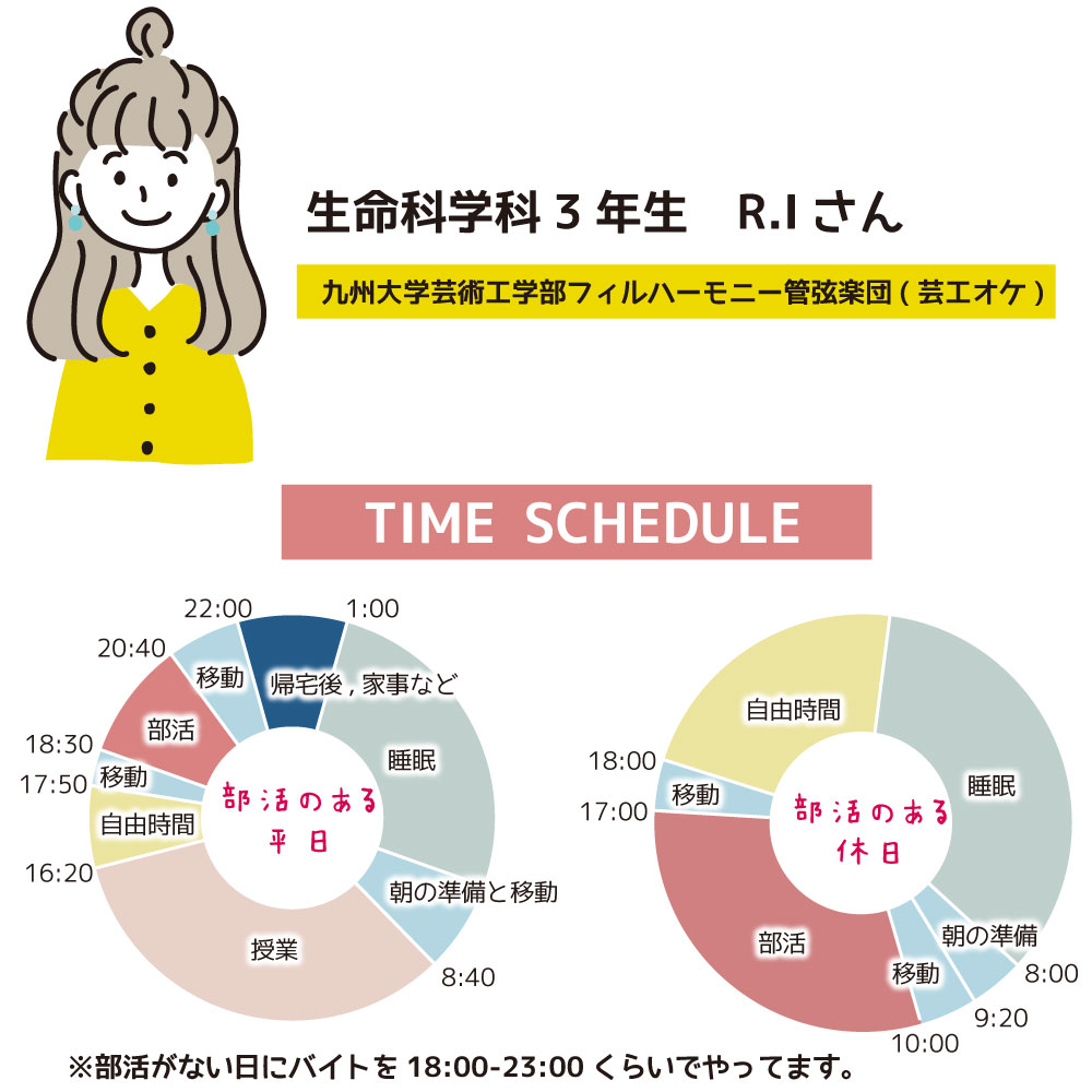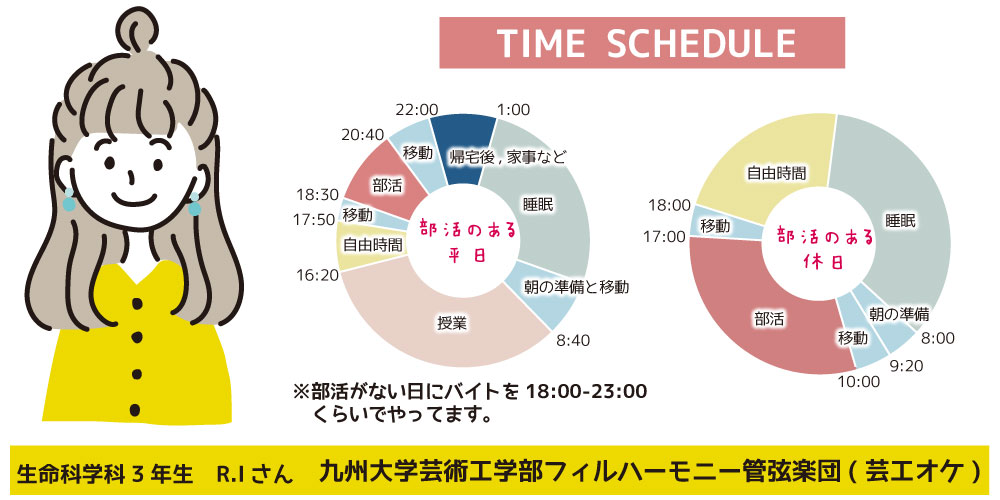- 平日は、 8:40~16:20授業 伊都キャンパスへ移動 17:00~21:00部活 22:00帰宅 1:00就寝※部活がない日は18:00~24:00でバイトをします。