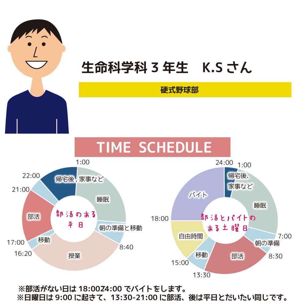 - (部活のある平日) 8:40-16:20 授業 17:50-18:30 大橋キャンパスへ移動 18:30-20:40 部活 22:00帰宅 01:00就寝 ※部活がない日にバイトを18:00-23:00くらいでやってます。 (部活のある休日) 8:00 起床 9:20-10:00 移動 10:00-17:00 部活 18:00- 自由時間