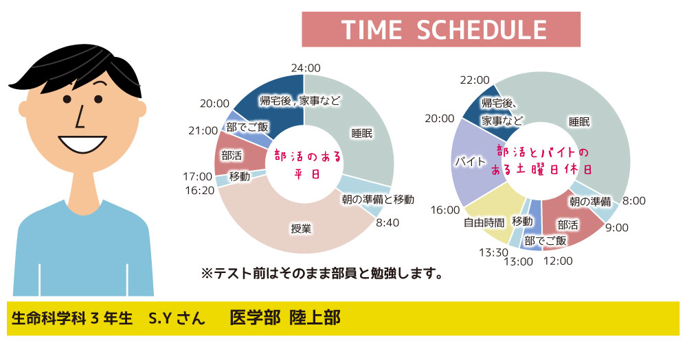 - 平日は、8:40~16:20授業 17:00~19:00部活 19:00~20:00部でご飯 24:00就寝 テスト前はそのまま部員と勉強します。