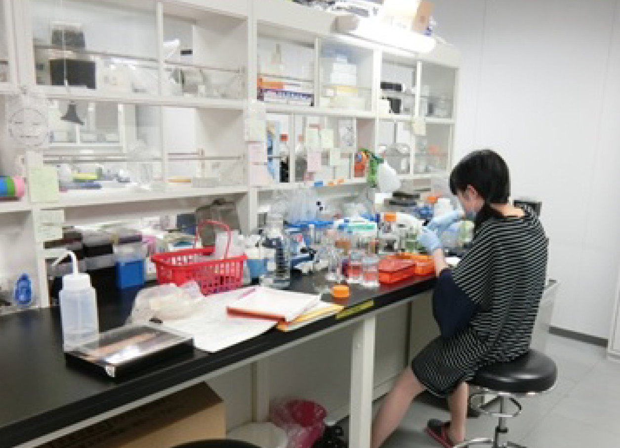 細胞の培養をしたり分子生物学実験をしたりと、学生や研究員が熱心に研究をしています。