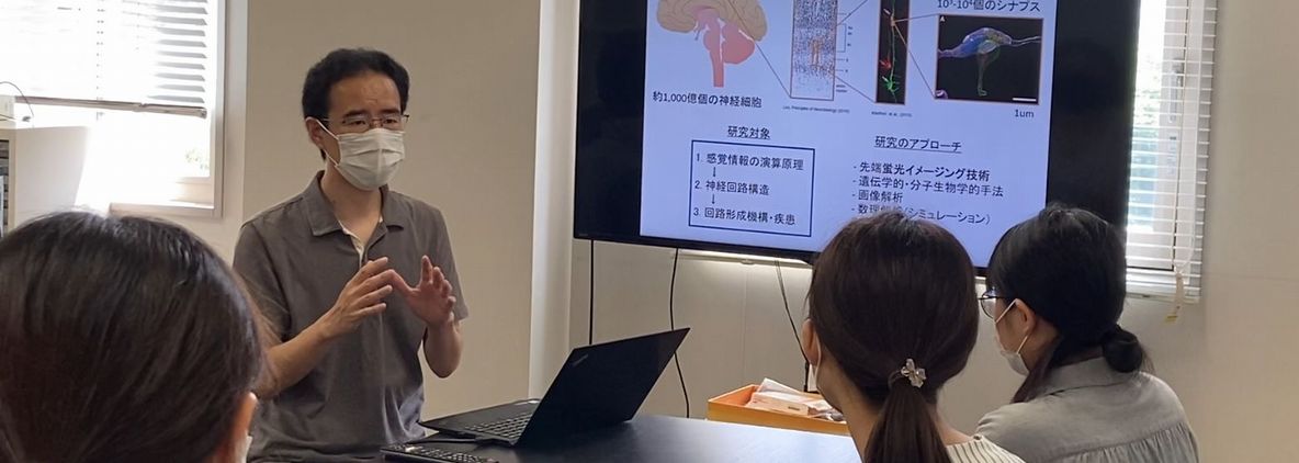 - この研究室では、私達の心や人格、精神疾患などに関わる、脳について研究を行っています。脳の接続様式を読むことによって、情報処理、脳の疾患、発達過程が分かるので一つのプラットフォームになるのではないかと考えています。脳はヒトでは1000億もの神経があり、その接続は複雑なのであまり解明されていない領域です。脳の中でどのように情報処理が行われているか、どのような神経回路の構造があるのか研究し、最終的には脳がどうやってできるのか、どの部分の変化により疾患が起きるのか、とつなげていきたいと考えています。 この研究室では主に先端蛍光イメージングを用いており、そこがユニークな部分だと思います。他にも、遺伝学的・分子生理学的手法、画像解析、シミュレーションなどを駆使しながら研究を行っています。