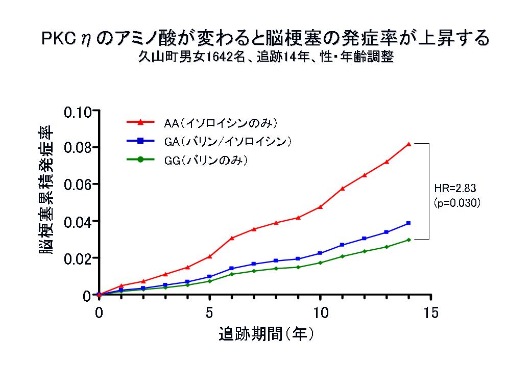 約3万個あるといわれるヒトの遺伝子は、いずれも4つの塩基の配列からなるが、人によって配列が異なっているところがある。研究チームは脳梗塞の患者さん1126人と同数の久山町の健常人を比較して、違いの見られる遺伝子を12個絞り込んだ。そのうちの一つPRKCHを調べて、塩基のグアニン(G)がアデニン(A)と入れ替わっている部分(一塩基多型、SNP)に注目した。この多型によってヒトはAA、GG、GAの3タイプに分けられるが、脳梗塞の患者さんにはAを持つ人が健常人に比べて1.7倍多かった。さらにこの遺伝子タイプが脳梗塞発症の危険因子になるのか否かを検討するために、1988年の久山町の住民健診で脳卒中のなかった1642人について、その後14年間にわたって脳梗塞発症率とこの遺伝子との関係を調べた。するとAAタイプの遺伝子の人は、GGの人よりも2.8倍も発症率が高かった。PRKCH遺伝子はプロテインキナーゼCエータ(PKCη)というたんぱく質を作るが、その働きはこれまで不明であった。しかし今回の研究で、AAの人は他よりもPKCηの活性が1.6倍高く、活性化されると動脈硬化がより進むことが明らかとなった。以上のことからPRKCH遺伝子が脳梗塞の発症に関わっており、とりわけAAタイプの関与が大きい事が判明した。