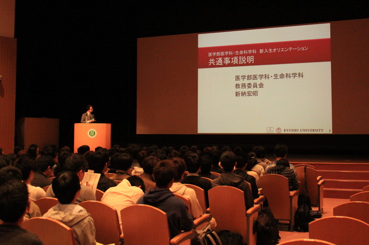 学部長挨拶の後、医学科・生命科学科教務委員長である新納宏昭教授(医学教育学講座)から医学科、生命科学科の専攻教育科目共通事項について説明があり、その後、学科に分かれてそれぞれの履修解説が行われました。