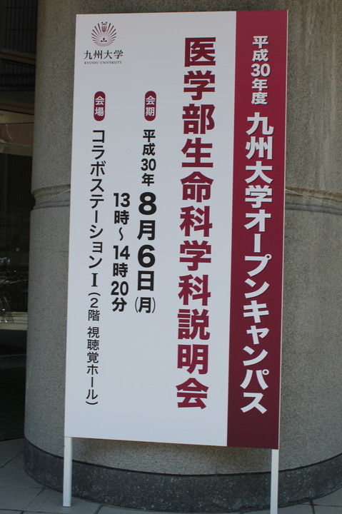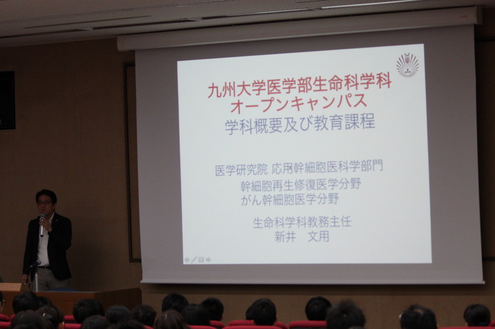 次に、生命科学科教務主任の新井文用教授から、九州大学の基幹教育や、生命科学科独自の専門教育科目等のカリキュラムについて説明を行いました。当学科では、1年次で基幹教育科目を伊都キャンパスで学び、2年次から専門教育科目を病院キャンパスで学びます。2年次から3年次前半には医学科と共通の基礎医学を学び、3年次では生命科学科独自の授業と並行して、「研究室配属」の機会により実際の研究活動に触れることとなります。さらに4年次では卒業研究を通して個別の課題に挑戦します。当学科ではこのように研究を重視した特長的な教育システムを持っており、新井教授はそれぞれについて分かりやすく説明を行いました。