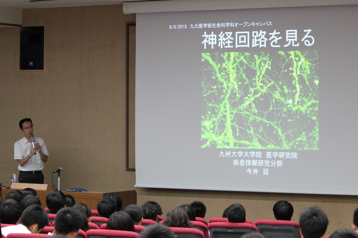 次いで、疾患情報研究分野 今井猛教授による、「神経回路を見る」と題した講話を行いました。 現在携わっている脳に関する研究の話や基礎研究の社会における意義について話すとともに、自身の経験を例に上げながら学生時代に同じ志しを持ち、お互い高めあう友人関係を築いた方が良いこと、理学部出身の視点から見た医学部に生命科学科が設置されている当学科の長所、研究者のキャリア形成について分かりやすく話しました。