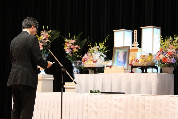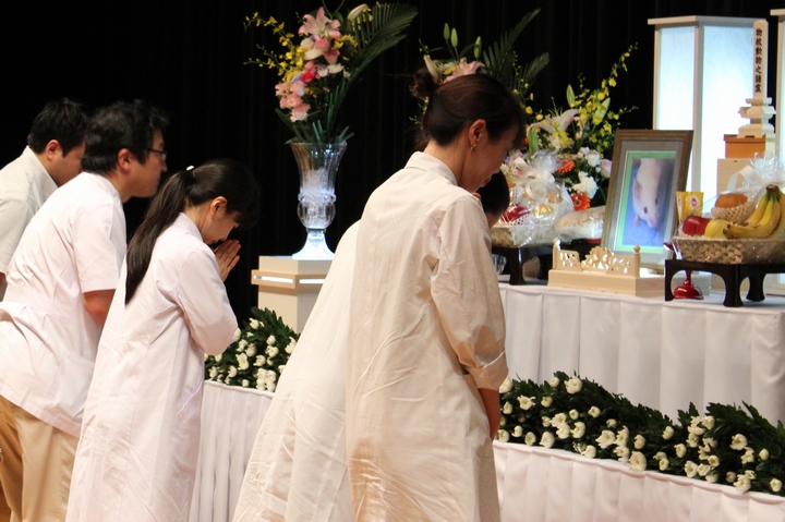 約260名の教職員・学生が参列し、始めに参加者全員で黙祷を行った後、住本研究院長から「慰霊の言葉」が述べられました。引き続き、小野動物実験施設長から弔辞があり、動物実験施設長は「今後とも、動物実験に従事する私達は、国内外の規制の動向や科学的知見に関する情報の収集に努め、3R(代替法の選択、使用数の削減、 苦痛の軽減)と実験動物学の三大統御(環境統御、微生物統御、遺伝統御)を実践することで、 実験動物の福祉の実現と動物実験の再現性確保に取組む所存である。」と述べられました。