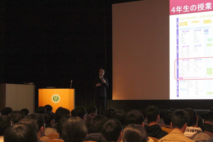 学部長挨拶の後、医学科・生命科学科教務委員会副委員長である新納宏昭教授(医学教育学講座)から医学科、生命科学科の専攻教育科目共通事項について説明があり、その後、学科に分かれて医学科は新納宏昭教授から、生命科学科は生命科学科長の伊藤隆司教授(医化学分野)からそれぞれ履修解説が行われました。