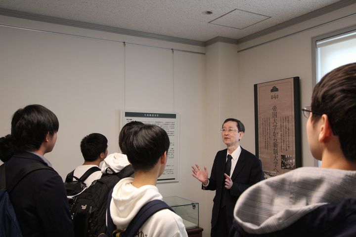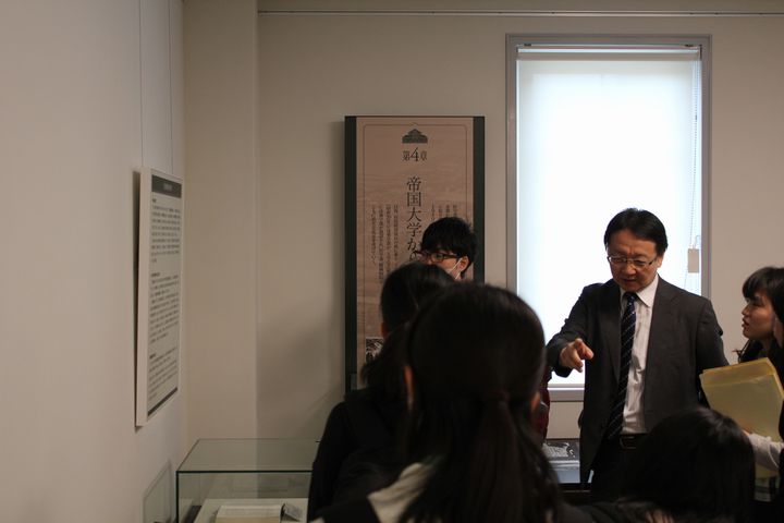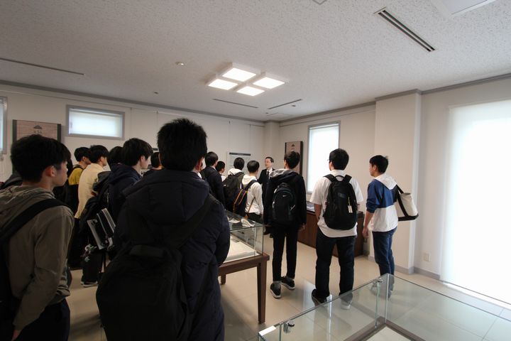 履修解説の後は、再び大ホールにおいて、医学学生係長から医学部在学中の注意事項等が、医学部同窓会から講話および同窓会についての紹介があり、その後、グループに分かれて医学歴史館を見学し、展示品を前に医学部の歴史について説明を受けました。