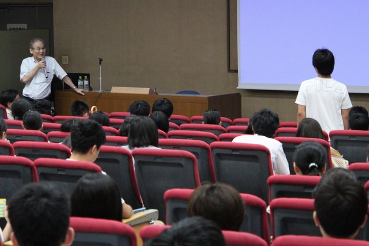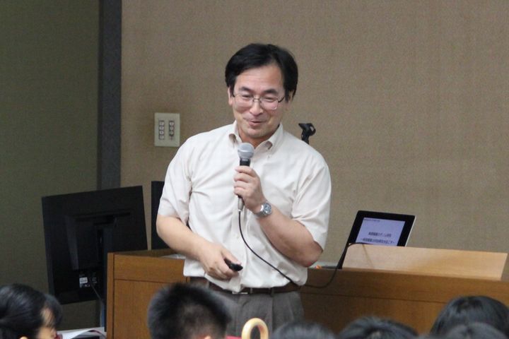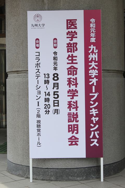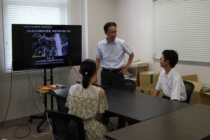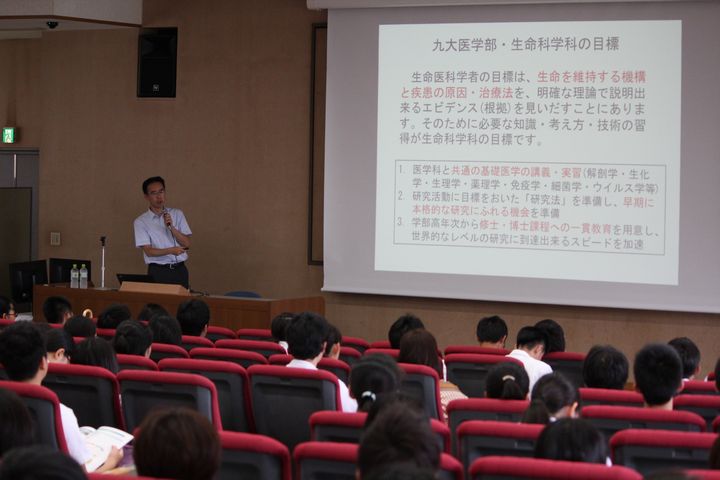 次に、生命科学科教務主任の今井猛教授から、九州大学の基幹教育や、生命科学科独自の専門教育科目等のカリキュラムについて説明を行いました。当学科では、1年次で基幹教育科目を伊都キャンパスで学び、2年次から専門教育科目を病院キャンパスで学びます。2年次から3年次前半には医学科と共通の基礎医学を学び、3年次では生命科学科独自の授業と並行して、「研究室配属」の機会により実際の研究活動に触れることとなります。さらに4年次では卒業研究を通して個別の課題に挑戦します。当学科ではこのように研究を重視した特長的な教育システムを持っており、今井教授はそれぞれについて分かりやすく説明を行いました。
