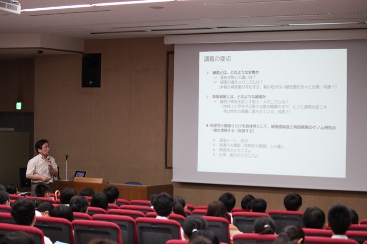 次いで、細菌学分野 林哲也教授による、「病原細菌ゲノム研究~病原細菌は何故病気を起こすのか~」と題した講話を行いました。「 細菌とは、どのような生物か」に始まり、病原細菌の概要説明から具体例として病原性大腸菌O157の細菌感染症から病原細菌のゲノム研究へのつながりを話されました。