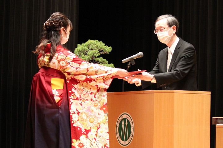 本年度は、新型コロナウイルスの感染が拡大している国内の状況に鑑みて、卒業生・修了生、保護者の皆様が一堂に会しての式典は行わず、出席は各学部の総代12名と大学院総代3名、および事前申し込みによる参加希望者のみに限り、学部の式典は2部制にして開催しました。
