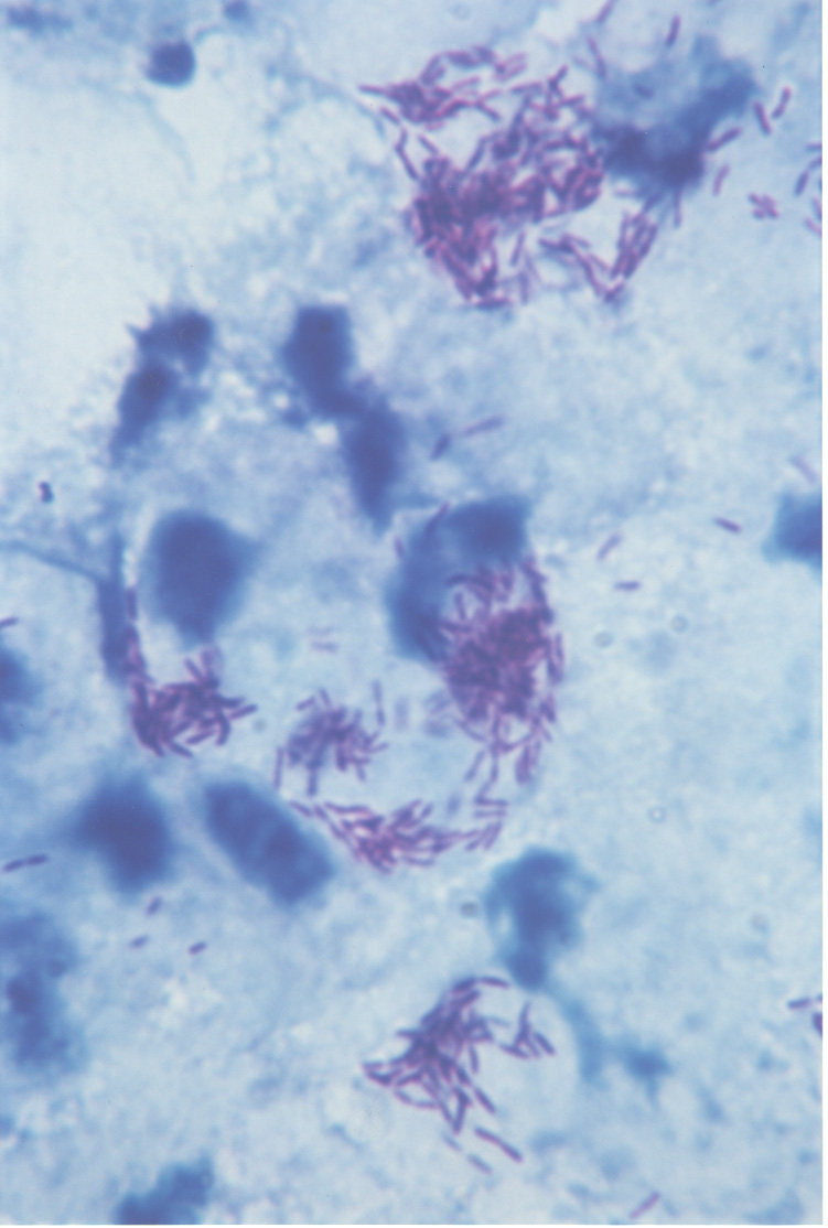 <写真説明>棒のように見えるのが、マクロファージの中で増殖しているレジオネラ。青色はマクロファージの核。(光学顕微鏡写真)