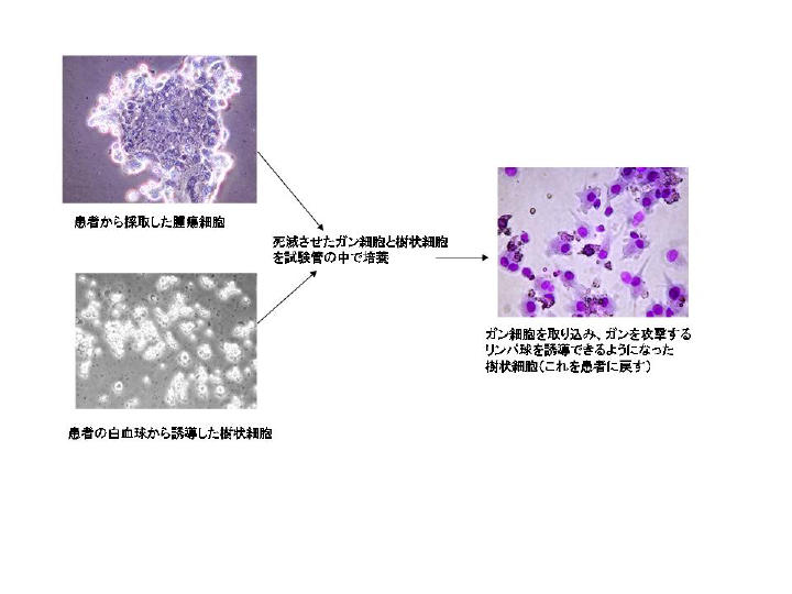 ガン細胞を取り込んだ樹状細胞をワクチンとして患者に注入する。そして樹状細胞からの連絡を受けて、実際にガン細胞を攻撃するリンパ球の一部を患者から取り出して、活性化(数を増やす)し、活性化リンパ球を患者に注入する。これを数回にわたって治療する。この療法は、他人のガン細胞を用いるのも可能だ。