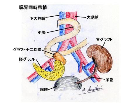 <イラスト説明> 提供者のお腹の中で繋がっていたそのままの形で、膵臓と十二指腸を一緒に最初に移植する。そのあとで、腎臓を移植する。