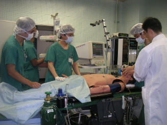 九州大学医学部は1995年、全国に先駆けてコンピュータ模擬患者を導入した。この患者人形は人間と同じように呼吸し、生体反応を見せる。この日は、高齢者の胃がん摘出手術中に大量出血という緊急事態を想定し、医学生男女6人が麻酔の模擬実習をした。