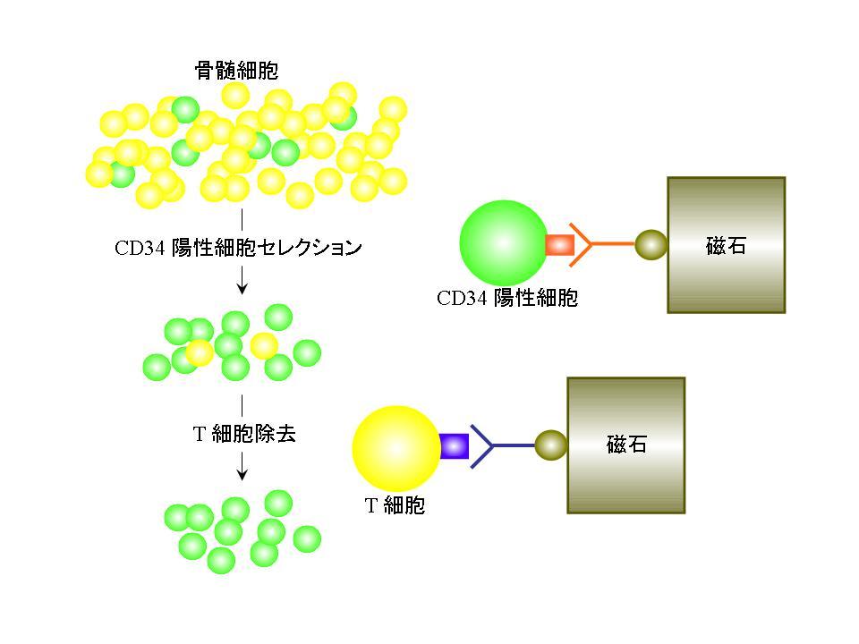 <イラスト説明>骨髄からCD34陽性細胞を特殊な磁石で選び出して、さらにその中から同じような方法でT細胞を取り除いて純化する。