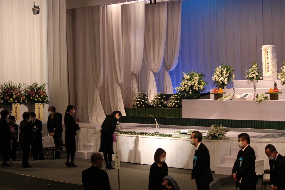 九州大学医学部・歯学部篤志者慰霊祭が、12月03日(土)にユウベル積善社福岡斎場(福岡市中央区古小烏町)にて、無宗教の形式で執り行われました。篤志者慰霊祭は、医歯学の教育と研究のためにご献体をいただいた尊い御霊に感謝を捧げ、御霊がやすらかであることをお祈りするもので、明治38年に萬行寺ではじめて執り行われ、本年で第114回目を数えます。例年、医・歯学部の学生がスタッフとして準備と運営に尽力しています。