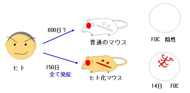 <イラスト説明> 実験用のマウスに、ヒトのプリオン病を発病させるには通常600日もかかり、発病しないマウスもいる。ヒト化マウスを使うと感染後150日ですべてのマウスが発病する。しかも感染して14日後には、脾臓やリンパ節のFDC(臚胞樹状細胞)で異常プリオンを検出、感染したと判定できる。