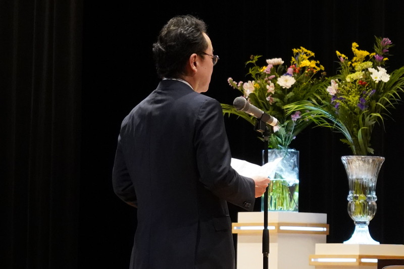 約220名の教職員、学生が参列し、始めに参加者全員で黙祷を行った後、赤司研究院長から「慰霊の言葉」が述べられました。 その後、参加者全員で献花を行い、動物慰霊祭を終えました。