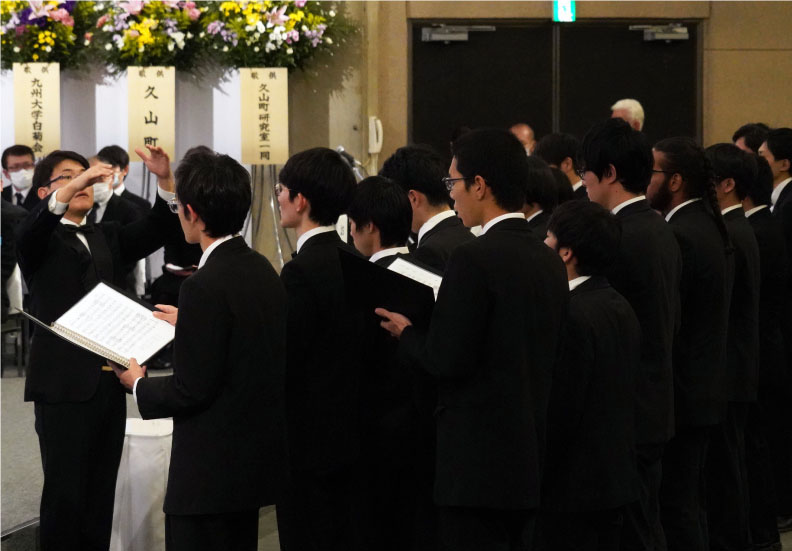 その後、九大コールアカデミー(男声合唱団)により鎮魂歌2曲が奉唱されました。1曲目の「薔薇ノ木ニ薔薇ノ花サク」は、北原白秋の詩集「白金の独楽」に収められている詩で、「薔薇の木に 薔薇の花咲く 何事の不思議なけれど」という詩に、命が生まれ・受け継がれていくことの神秘や感動が込められています。2曲目には「ヒポクラテスの歌」が奉唱されました。ヒポクラテスはギリシア時代の医師で医学の神様とされており、命を尊び、医学への畏敬の念や、医学を信じ、それに従うことの厳粛な決意を詠っています。2曲ともにコールアカデミーの前常任指揮者であり、自らもご献体された、故 藤井凡大先生の作曲です。