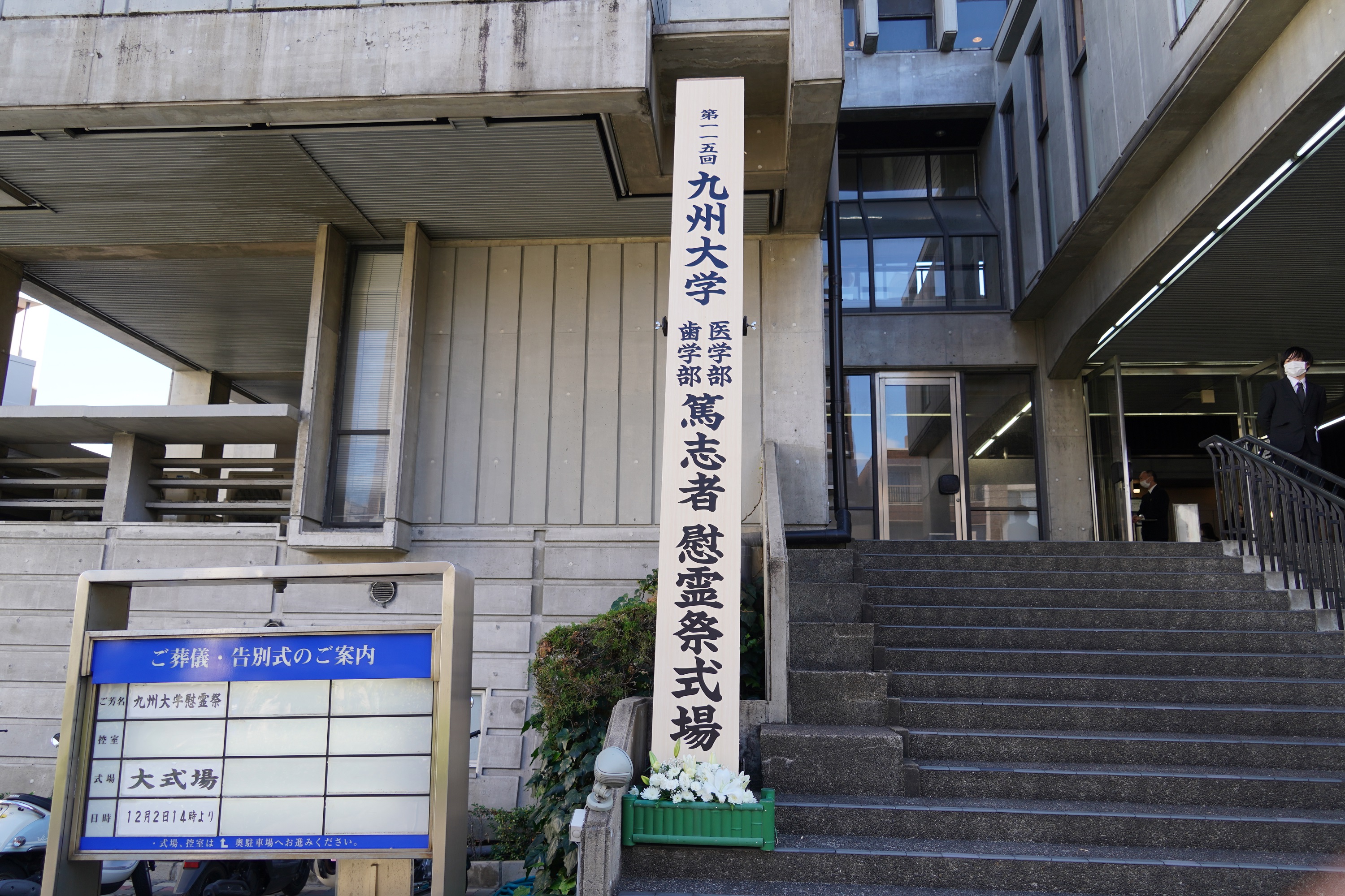 九州大学医学部・歯学部篤志者慰霊祭が、12月02日(土)にユウベル積善社福岡斎場(福岡市中央区古小烏町)にて、無宗教の形式で執り行われました。篤志者慰霊祭は、医歯学の教育と研究のためにご献体をいただいた尊い御霊に感謝を捧げ、御霊がやすらかであることをお祈りするもので、明治38年に萬行寺ではじめて執り行われ、本年で第115回目を数えます。例年、医・歯学部の学生がスタッフとして準備と運営に尽力しています。本年度は医学部から12名、歯学部から5名が参加しました。