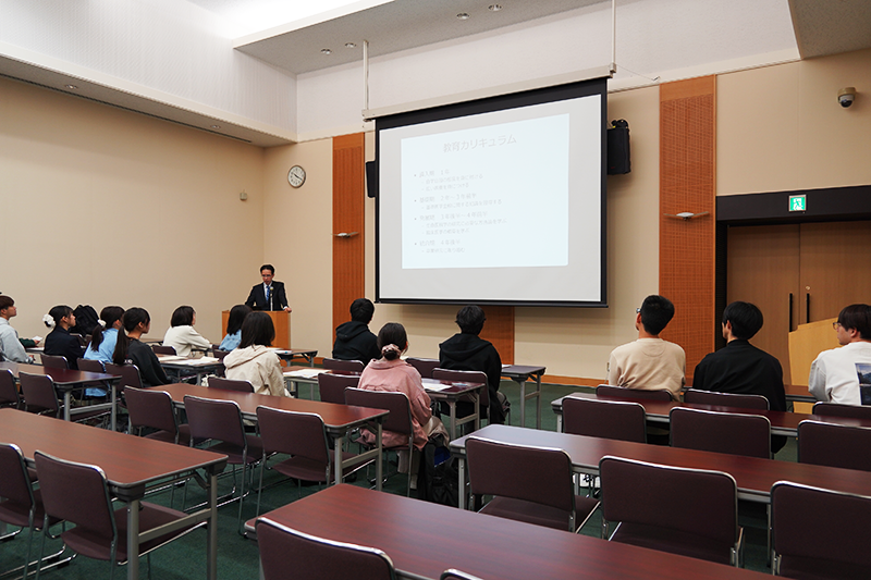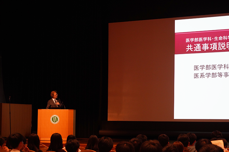 冒頭では須藤 信行学部長が挨拶を行い、新入生へお祝いと激励のメッセージを贈りました。その後、新納 宏昭教務委員長が医学科及び生命科学科の専攻教育科目共通事項について説明を行いました。続いて、学科ごとに履修説明があり、医学科は新納教務委員長が、生命科学科は今井 猛生命科学科教務主任が、それぞれ説明を行いました。最後に同窓会や医学部サークルからの案内があり、医学歴史館を見学してガイダンスを終えました。