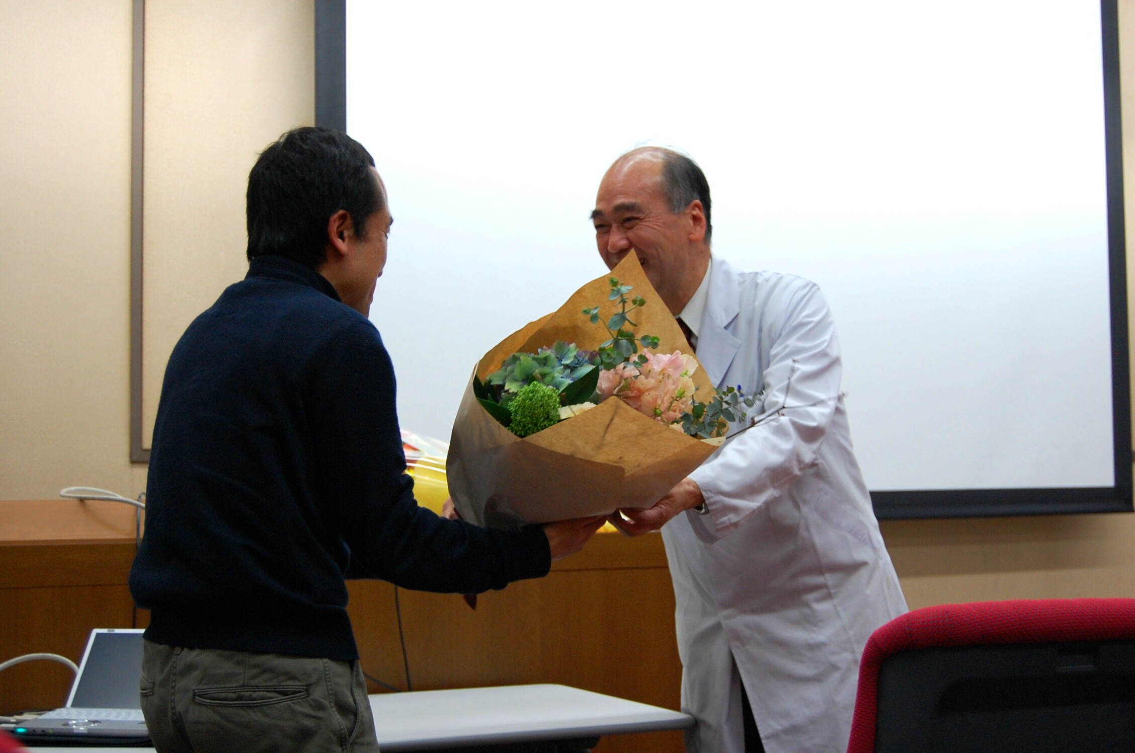 最終講義のテーマは、「田原結節の分子解剖学-ギャップ結合コネキシン分子と心臓の発生-」でした。今回の講義は、心臓の刺激伝導系の解明に偉大な足跡を残された田原淳名誉教授の業績のご紹介を導入とし、ご自身の研究の歩み、すなわち、電子顕微鏡を用いた超微形態学的解析からノックアウトマウスを用いた最新の分子生物学的手法による研究成果を、医学部学生向けにわかりやすく話されました。昭和40年、先生が入学された頃の九州大学医学部の旧建物の写真、解剖学教室に入局されたばかりの頃の若き柴田先生のお姿や、その時代ならではのエピソードを交え、コネキシンの遺伝子がクローニングされる前のB.C.(Before Cloning)の時代に如何に研究をお始めになったのか、また、留学中に経験された日米の研究環境の差や、帰国後の更なる研究の展開へと、息つく間も無い感動的なストーリーの展開で、医学部の学生ばかりでなく、新しい大学教育の試みとしてご自身が立ち上げに関わられた21世紀プログラムの学生・教員、高柳医学研究院長を初め同僚教員等、多くの聴衆を魅了されました。最後に、Always new challengesというお言葉を我々に託されて、たいへん好評のうちに講義を終了されました。