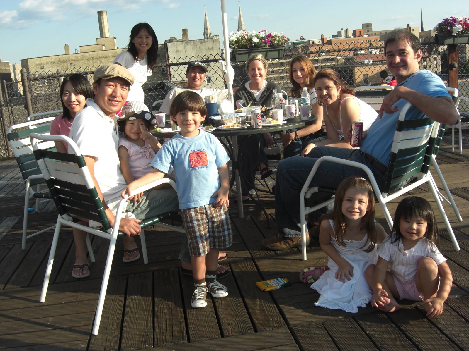 〈写真説明〉1. 42階建て、高さ160mのゴチック建築「学びの聖堂」は、教育機関としては全米1(世界2位)の高さを誇るピッツバーグ大のシンボル。「アメリカの技術力、資源力、歴史の重みに感動した」と吉田さん。2.自宅のアパート屋上で、アメリカ、コロンビア、ブラジル出身の同僚家族とパーティー。(左から2人目が吉田さん)
