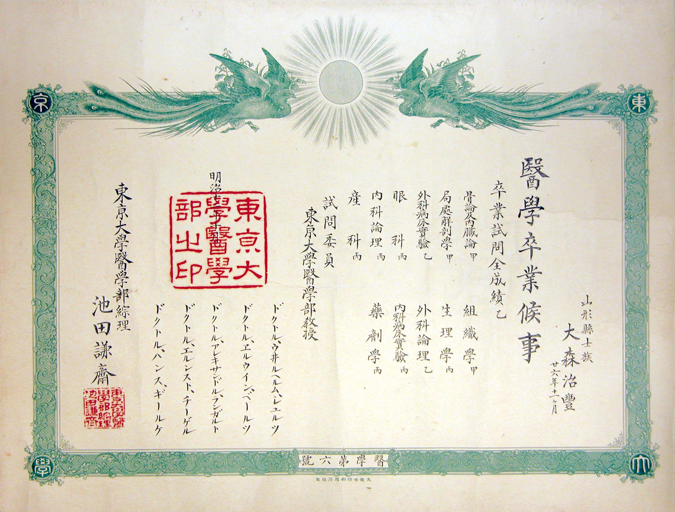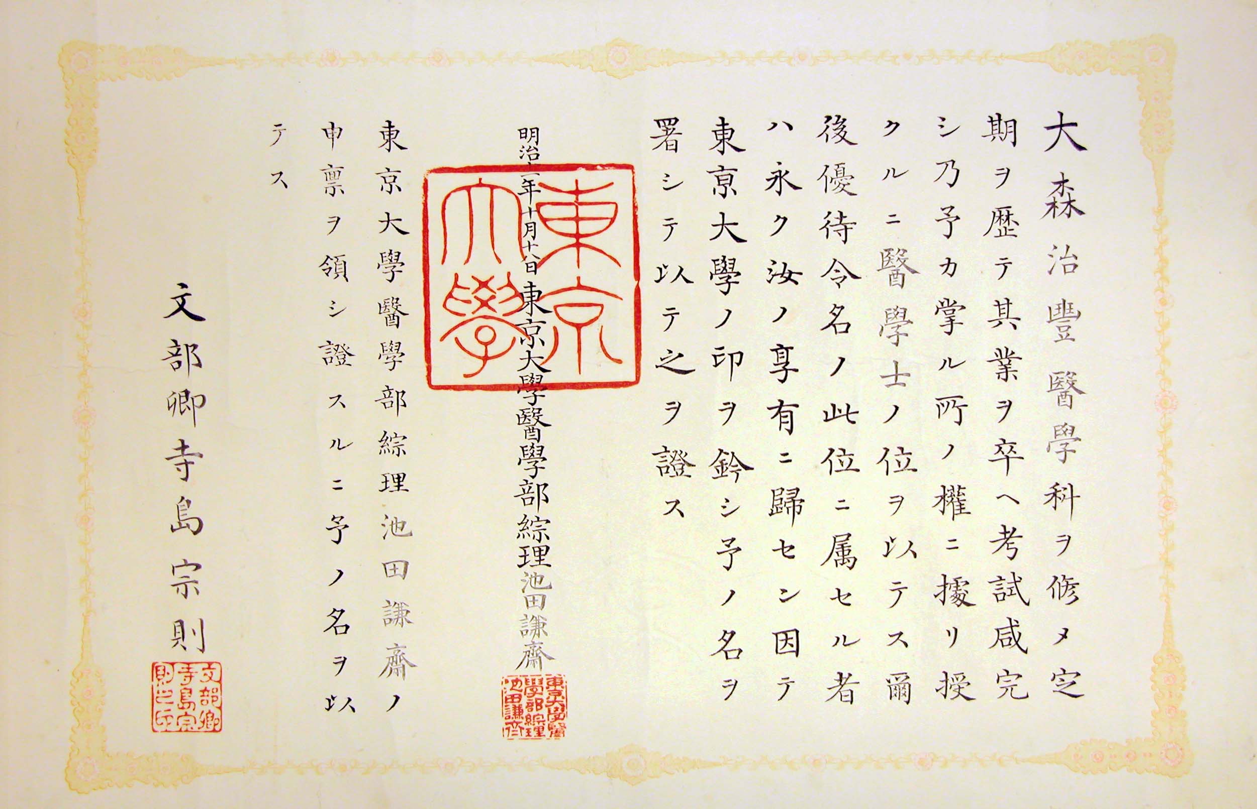 医科大学設立に関わる資料から、本人の大学卒業証書、成績表、辞令、書簡、手記、写真、叙勲資料、園芸日誌、看病記録に至るまで多種にのぼる。とりわけ大学史・学術史として貴重なのが、明治12年10月に東大医学部を卒業した学位証書。明治12-18年の「東京大学」時代は、「学士」という学位証書と卒業証書がセットになっており、当時の医学関係の学位証書として、東大にも保存例がない。明治19年から近年までは「学士」は単なる称号とされ、「学士」が「学位」として復活したのは、平成3年4月の学校教育法改正からである。