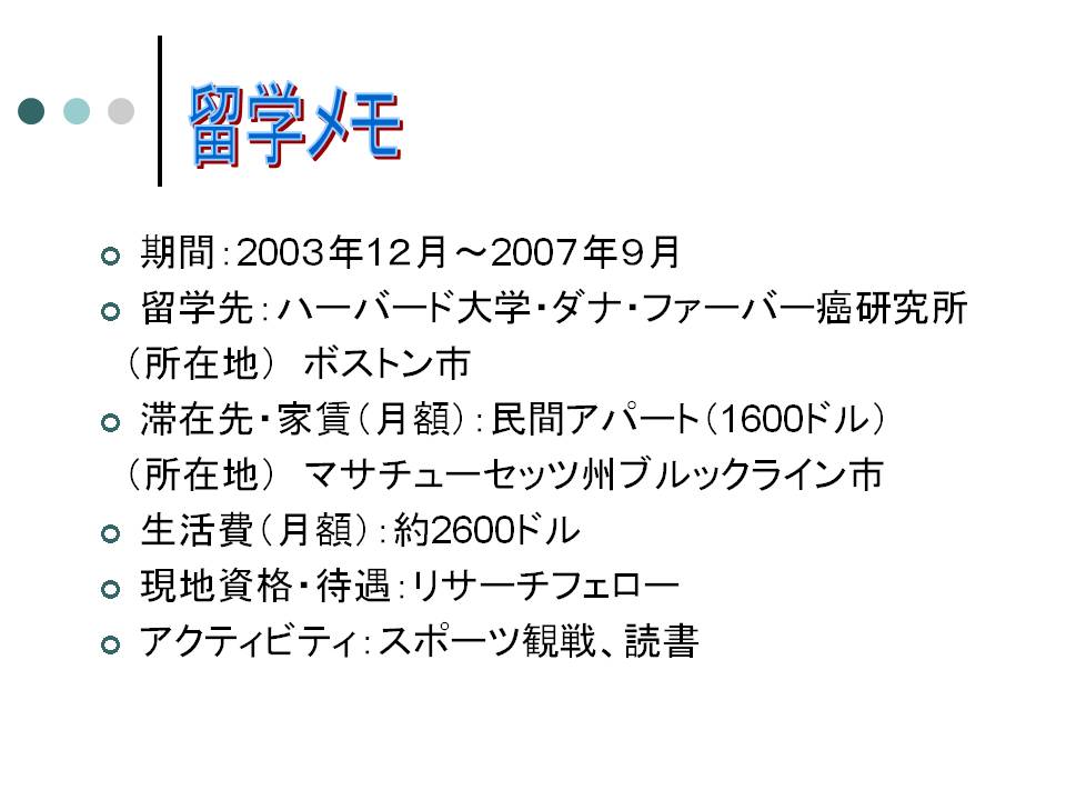 有信さんは当時、ダナ・ファーバー癌研究所で助教授として研究室を主宰していた現九大医学研究院の赤司浩一教授(病態修復内科学教授)に、2003年から師事した。赤司教授は、「造血幹細胞の分化メカニズム」(2006年3月7日付け欄参照)、分かりやすくいうと血液の幹となる細胞からどのようにして、白血球や赤血球等の機能する特殊化した細胞へ分化するのかの経路図を完成させたことで世界的に知られる。有信さんはその分化経路図作成研究チームの一員だった。このときに共同研究したのが、同じ建物の別の階にいたK Frank Austen教授。同教授は、アレルギー研究の世界的な権威の1人である。