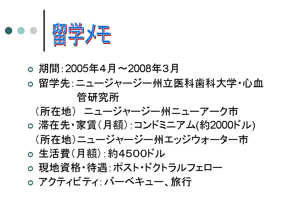 後に留学先のボスとなったニュージャージー州立医科歯科大学(University of Medicine and Dentistry of New Jersey New Jersey Medical School)・心血管研究所(Department of Cell Biology and Molecular Medicine)の佐渡島純一教授との出会いは、偶然が重なったもののそんな熱心な選択活動の一環から生まれた。