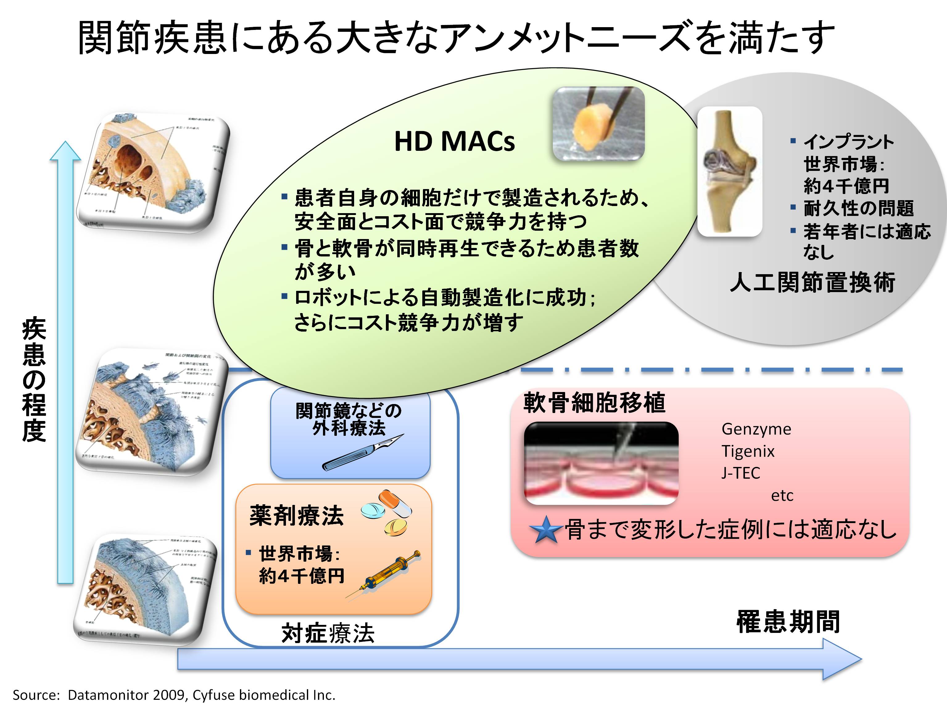 細胞を培養液中で培養・増殖させた後、鋳型に流し込み、特殊な条件下で培養することにより、細胞だけで任意の形状の立体構造体を作成する特許技術を活用し、関節疾患に対する再生医療技術の開発を行う。