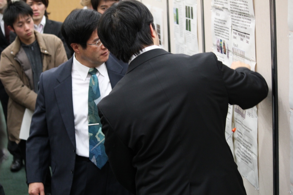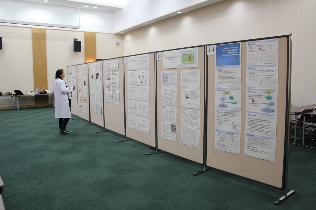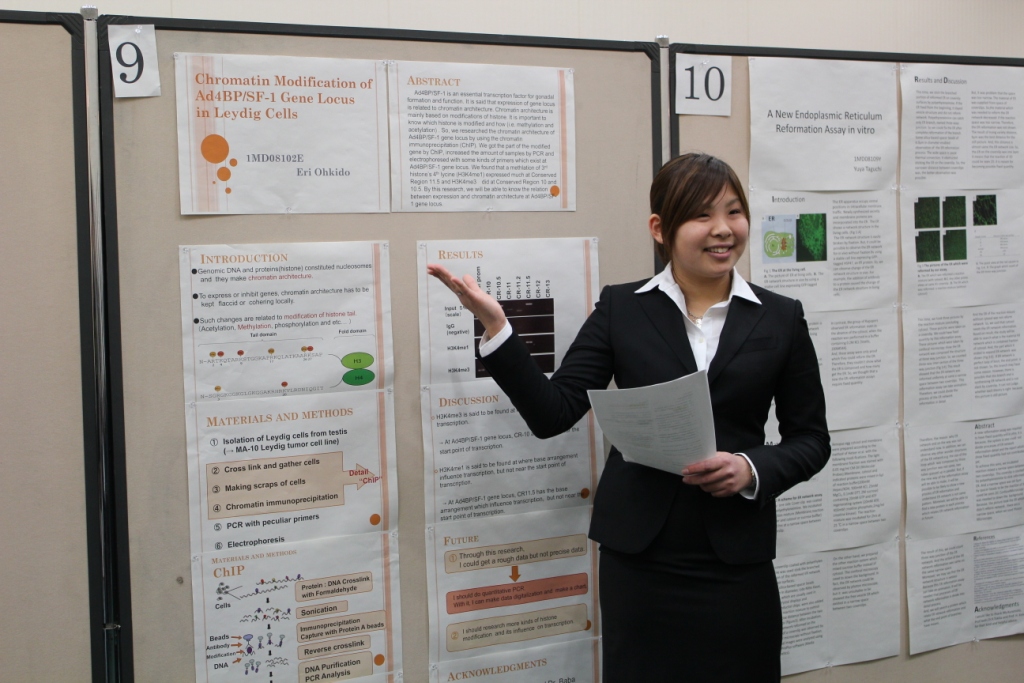 生命科学科3年生14名による英語によるポスター発表が2011年2月4日午後に百年講堂で行なわれました。発表内容は第3学年前期に設定された「早期研究室体験実習」での体験・成果を基に、論文に繋がる英文レポートを作成し、ポスターとしてまとめたものです。この模擬国際会議ポスター発表(Mock International Conference Poster Presentations)はタイトルから内容まで学生自身が工夫して作成したものです。