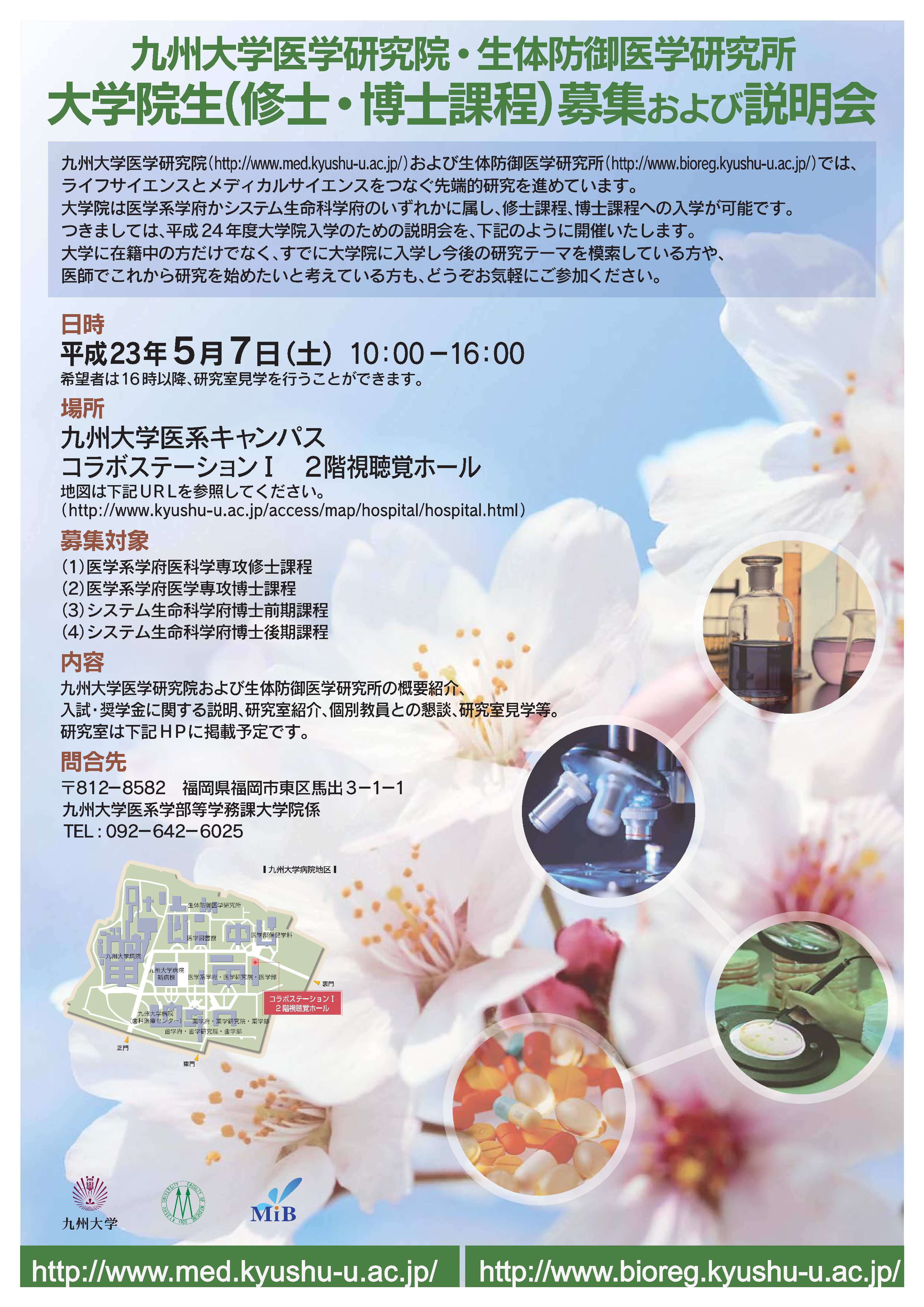 詳細は「九州大学医学研究院・生体防御医学研究所 大学院(修士・博士課程)募集および説明会」をご参照ください。