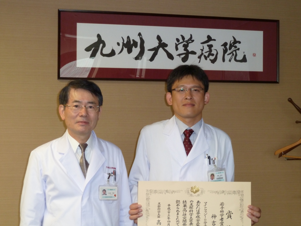 久保千春病院長と表彰状を手にした神吉智丈助教 |