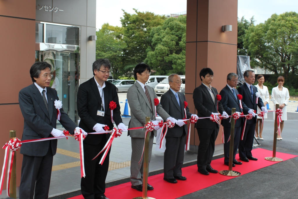 平成23年7月27日(水)、この先端医療イノベーションセンターの開所記念式典が開催されました。式典では、まずはじめに先端医療イノベーションセンターでテープカットが行われました。その後、医学部百年講堂へ場所を移し、九州大学 有川節夫総長から開所宣言がなされました。有川総長は開所宣言において「教育、研究、地域貢献において時代の要請に応えていくために、産官学連携に新しい考え方、取り組みを加え、戦略的に展開していく必要があるのと同様に、医療技術、医薬品、医療機器の開発についても新たな方法が必要になっていると思います。当センターの新しさ、ユニークさはそうしたニーズに応えようとする点にあります。」と述べました。