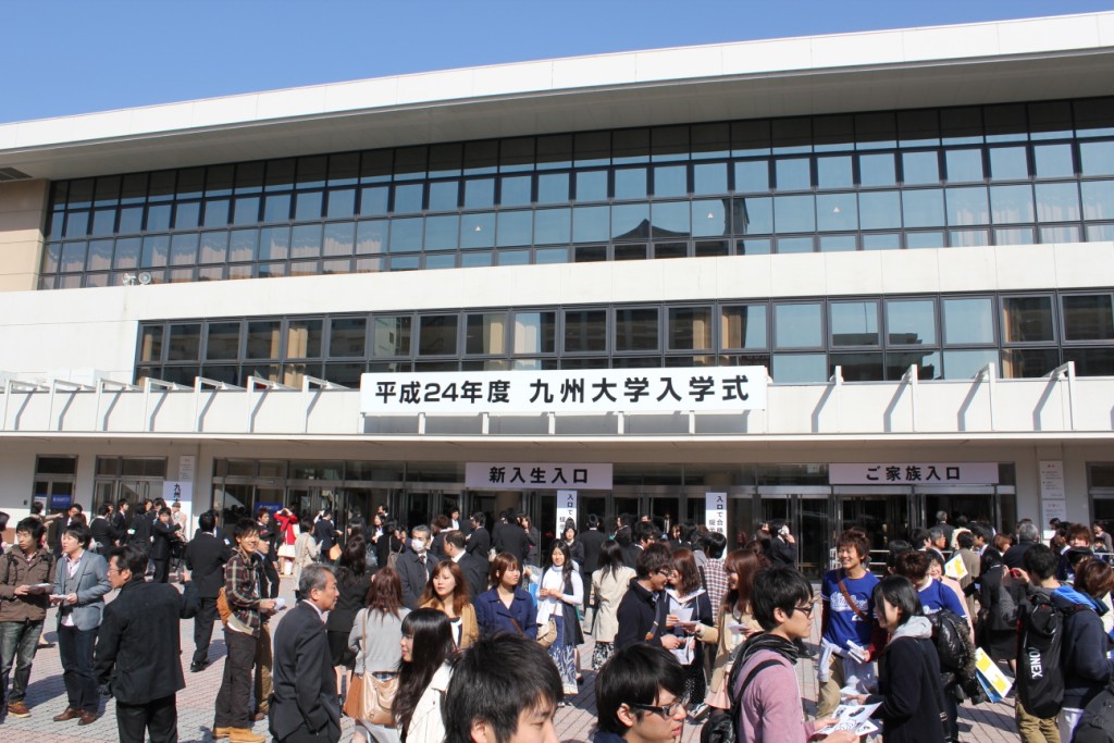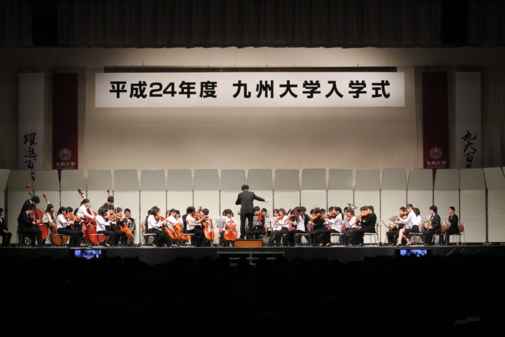日本列島を春の嵐が吹き荒れた前日までの天候とはうってかわった青空の下で、4月4日(水)の9時50分から「平成24年度入学式」が福岡国際センターで催され、合計2,679名が新たに九州大学のメンバーとなりました。式の冒頭9時30分からは九大フィルハーモニーオーケストラによって、恒例のリヒャルト・ワグナー作曲「ニュルンベルグのマイスタージンガー」が演奏されました。
