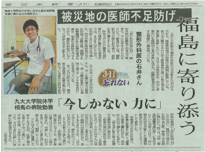 九州大学大学院医学系学府医学専攻の石井武彰さん(整形外科)が、大学院を休学し福島県相馬市の病院に勤務することで、東日本大震災で被害を受けた被災地の地域医療に貢献しています。