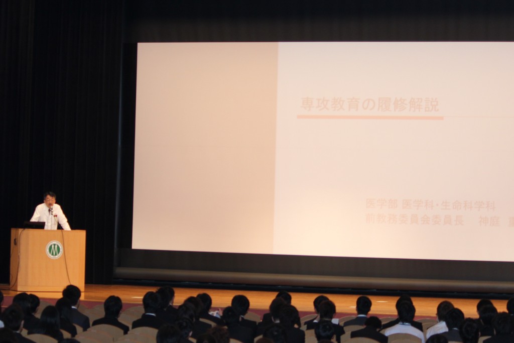 その後、前教務委員長 神庭重信教授(精神病態医学分野)から専攻教育科目の共通事項について説明があり、医学学生係から医学部在学中の注意事項等がありました。