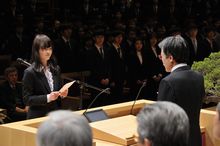 その後、新入生総代の21世紀プログラム 峰 萌絵(みね もえ)さんが、「私達は本学教育の趣旨を体して,自立の精神を重んじ,学術を極めるとともに,自ら人格の陶冶に努め,社会の期待に沿うことを誓います」と誓詞を朗読しました。